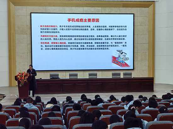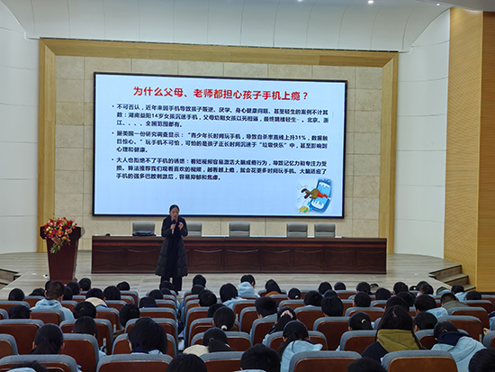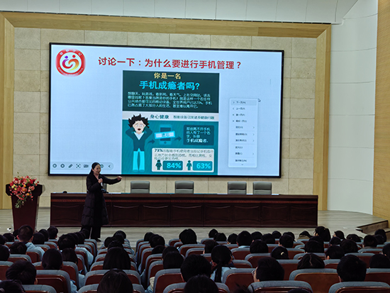 諸暨市楓橋鎮社區教育學校特邀諸暨市關工委幫扶團副團長、諸暨市民政局婚姻登記處輔導室負責人、諸暨市惠悅關心下一代服務中心主任蔡美作《青少年手機管理》的主題講座。她首先提問“為什么要進行手機管理?”四五個學生圍繞“身體健康”回答。蔡美介紹:全世界手機用戶已達75%,手機已然占據了大部分的生活,現在對那些離不開手機的人有了一個名稱,叫做手機成癮者,對身心健康帶來極大的隱患。接著,蔡美針對“為什么父母、老師都擔心孩子手機上癮?”“過度使用手機對青少年所造成的負面影響。”“為什么有的孩子容易沉迷‘垃圾快樂’?”“手機成癮主要原因。”“如何正確使用手機?”“如何戒掉手機成癮?”等問題,結合一個個案例與一幅幅圖示作聲情并茂闡述。