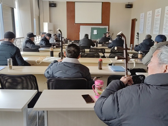 培訓老師施國旗正在為學員們專心授課。施老師一遍遍示范,領著學員們一遍遍齊奏。練習間隙,學員們踴躍提問,現場學習氣氛濃烈,這批學員年齡跨度大,最小的65歲,最大的90歲,大家干勁十足。施老師根據學員們的不同功底因材施教,及時給予個別輔導。循序漸進的教學讓學員們易于接受,大家都學得十分投入和認真,紛紛表示要珍惜此次學習機會。