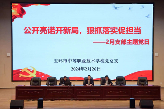近日,玉環市中等職業技術學校黨總支組織全體黨員在學校大報告廳開展“公開亮諾開新局,狠抓落實促擔當”主題黨日活動。會議由玉環市中等職技校黨總支副書記、校長吳德章主持。