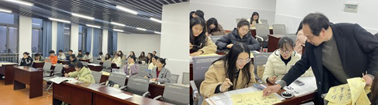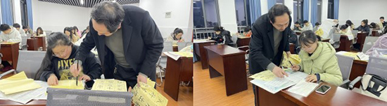 魏老師首先向大家詳細地講解了書寫的五指執筆法、運腕方法與書寫姿勢。隨后,結合會前大家提交的書法作品,給每位新教師提出了細致中肯的改進建議,并親手示范,讓老師們直觀感受書寫方法。在講解過程中,魏老師不僅向到場教師推薦了楷書練習的字帖,還論述了顏真卿、柳公權字體之間獨有的風格特點,年輕教師們也在名家墨寶的賞析中進一步體會到了古韻漢字的獨特魅力。