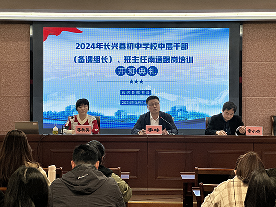 為切實提升長興縣初中中層干部(備課組長)與班主任專業(yè)素養(yǎng),3月24日,長興縣初中中層干部(備課組長)、班主任南通跟崗培訓班開班儀式在長興教師進修學院順利舉行,長興縣教育局黨委委員、人事科科長李峰,長興教師進修學院院長章小杰,長興教師進修學院副院長蔣秋英出席本次會議,100位教師參加活動。