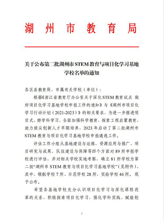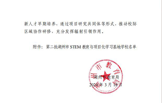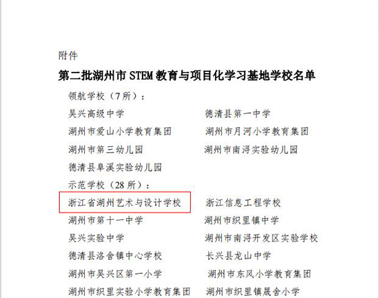 近日,湖州市教育局公布了第二批湖州市STEM教育與項(xiàng)目化學(xué)習(xí)基地校學(xué)校名單,藝校入選示范學(xué)校。