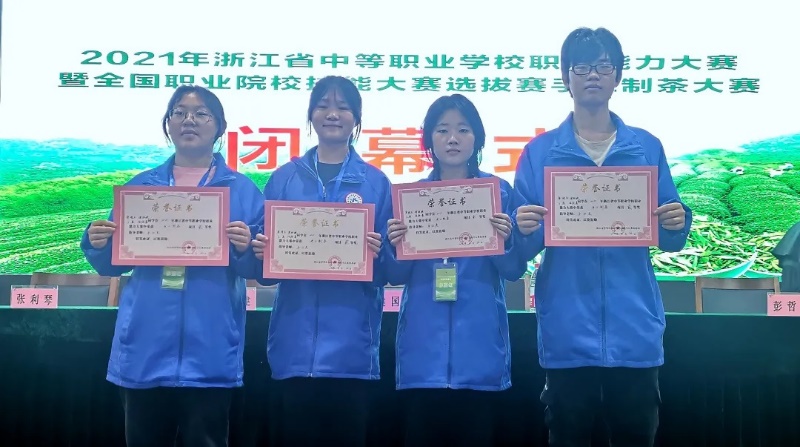 2021年,她與隊(duì)員們一起登上浙江省中等職業(yè)學(xué)校技能大賽手工制茶大賽的舞臺上,以扎實(shí)的理論功底、嫻熟的制茶技藝,榮獲學(xué)校團(tuán)體總分第二名的好成績。2022年6月,團(tuán)隊(duì)再次沖進(jìn)省賽,并榮獲大賽一等獎,順利拿到2022年全國職業(yè)院校中職手工制茶技能大賽的“入場券”,一鳴驚人。7月,她們?nèi)缭傅巧?022年全國職業(yè)院校技能大賽(中職組)手工制茶賽項(xiàng)的舞臺,與來自全國35個地區(qū)的140名選手同臺切磋,經(jīng)過三天激烈角逐,終于獲得全國三等獎佳績,填補(bǔ)了衢州市在國賽該賽項(xiàng)上的空白。