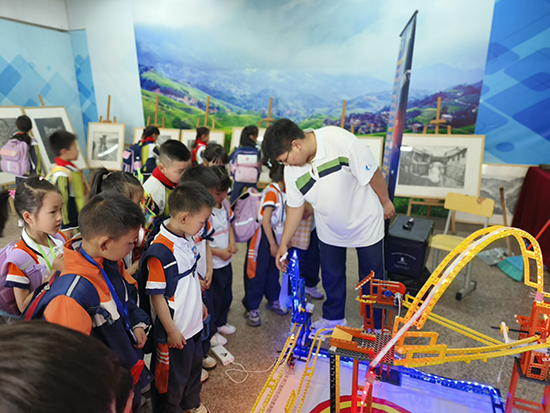 “小可愛”們首先來到學校的實訓樓參觀,用探究的眼光觀察著實訓室里的各種專業設備。為了迎接他們的到來,學校的創客小達人們還展出了自己的創意作品。看到“超能小球”、智能機器人等科技感滿滿的作品,小朋友們一下子化身為“好奇寶寶”,他們饒有興致地簇擁過來,津津有味地聽著大哥哥、大姐姐的講解,近距離地體驗到了科技創意的魅力。