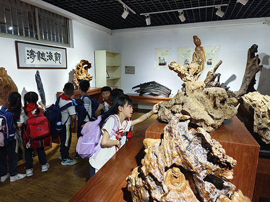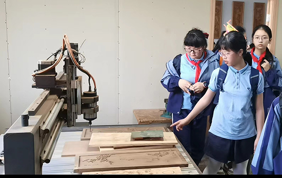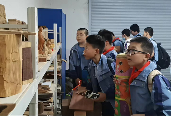 在學校的民間工藝精品館里,一件件獨具匠心的根雕、竹編、紫砂藝術作品贏得了小朋友們的“哇”聲一片。這些作品有的出自名家之手,有的是我校師生的作品,無聲地彰顯著特色專業的風采。大家還一起走進木雕實訓室,見證一塊不起眼的木頭被精雕細琢成靈秀作品的過程。極具嵊州地域特色的非遺技藝之美,以木相傳,潛移默化間浸潤少年的心,種下藝術審美的種子。