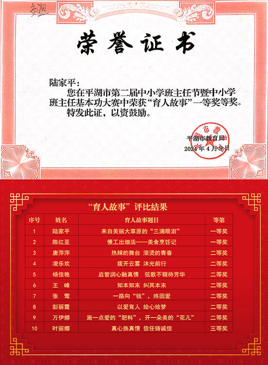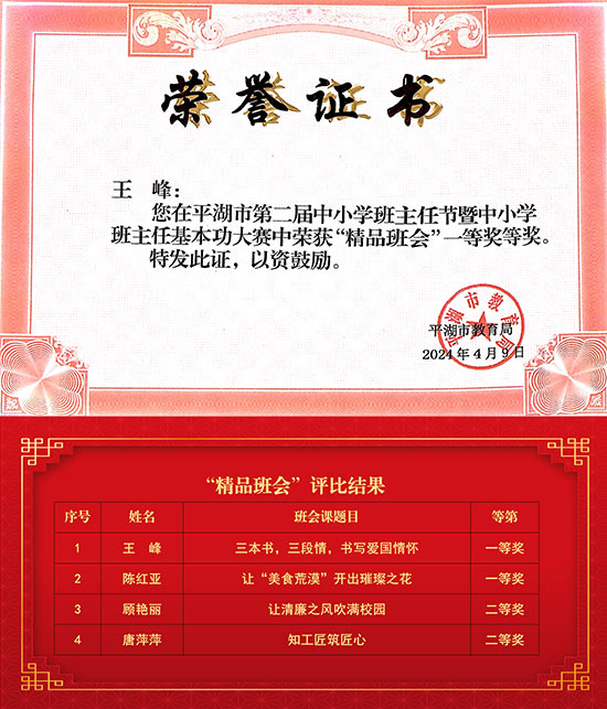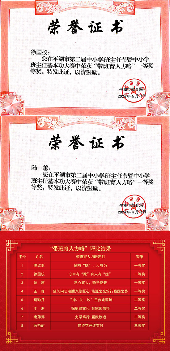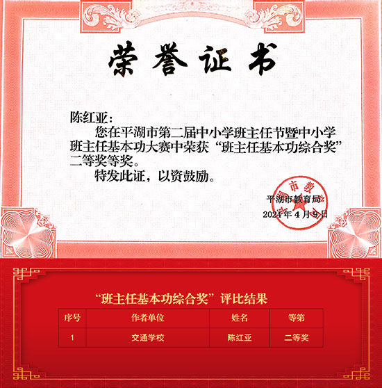 砥礪奮進勤耕耘,碩果芬芳佳績傳,近日,平湖市教育局公布了平湖市第二屆中小學班主任節(jié)暨中小學班主任基本功大賽評比結果,嘉興市交通學校(嘉興交通技工學校)教師在“精品班會”“帶班育人方略”“育人故事”比賽中喜獲8個一等獎、12個二等獎、2個三等獎,陳紅亞老師獲班主任基本功綜合二等獎!