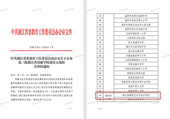 4月7日,中共浙江省委教育工作委員會公布第三批浙江省清廉學校建設示范校名單。浙江省湖州藝術與設計學校成功入選。