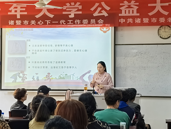 4月10日下午,諸暨市老年大學(xué)邀請(qǐng)諸暨市關(guān)工委幫扶團(tuán)副團(tuán)長(zhǎng)蔡美為老年學(xué)員舉行“預(yù)防校園欺凌”講座,近百人聽課。