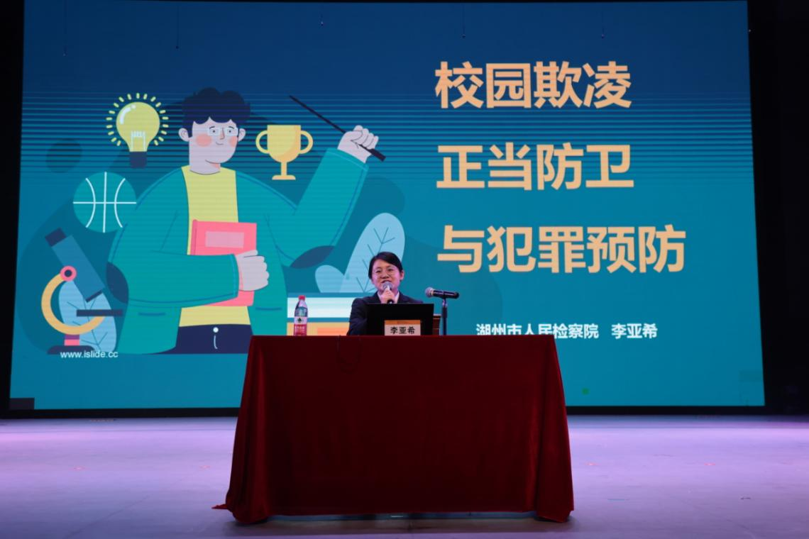 為加強學生對欺凌行為的認識,提高學生的自我保護意識,營造和諧、安全的校園環境,4月12日下午,浙江省湖州藝術與設計學校邀請湖州市人民檢察院第六檢查部檢查官李亞希到校,為全體同學作了題為《校園欺凌、正當防衛與犯罪預防》的專題講座。