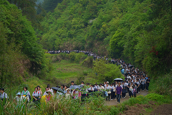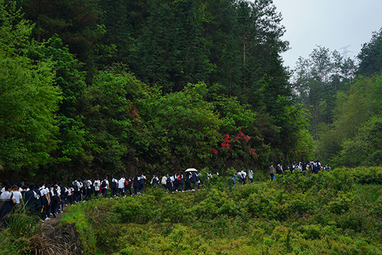 此次拉練途經新嶺村、河坑村、西弄村、梅壟水庫,最后返回學校。一路風景宜人,美不勝收。青山溪流旁,花草樹木間,拉練隊伍以兩路縱隊前進。同學們在途中激情而歌,動情而唱,志氣高昂,熱情飽滿。綿延的隊伍猶如一條長龍,成為山林間最亮麗的風景線。