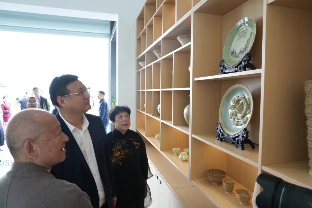 學校黨委書記、校長李忠躍和婺窯大師陳新華、花藝大師何小紅一同為大師工作室揭牌