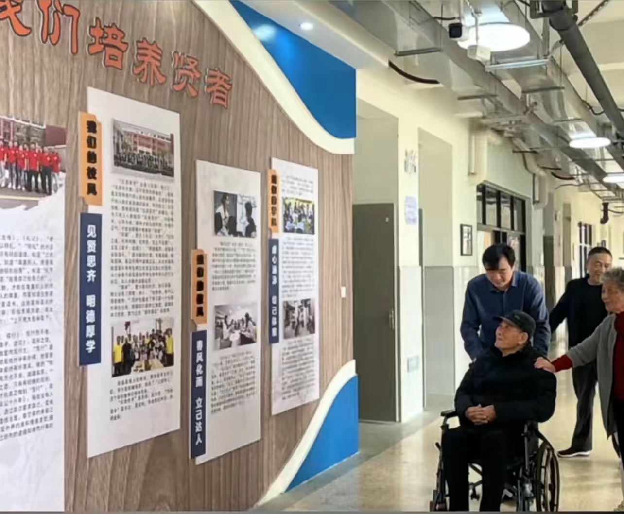 楊立波簡單地介紹了學校的概況、規模、特色及辦學水平。隨后推著輪椅引領大家走訪校園,“楓橋經驗”文化長廊、紅楓調解室、學校校史室與部分專用教室……老教師們對規模如此宏大美觀、設施這樣齊全現代、走廊裝飾美輪美奐、環境青翠蔥蘢的校園嘖嘖稱奇,驚嘆不已。