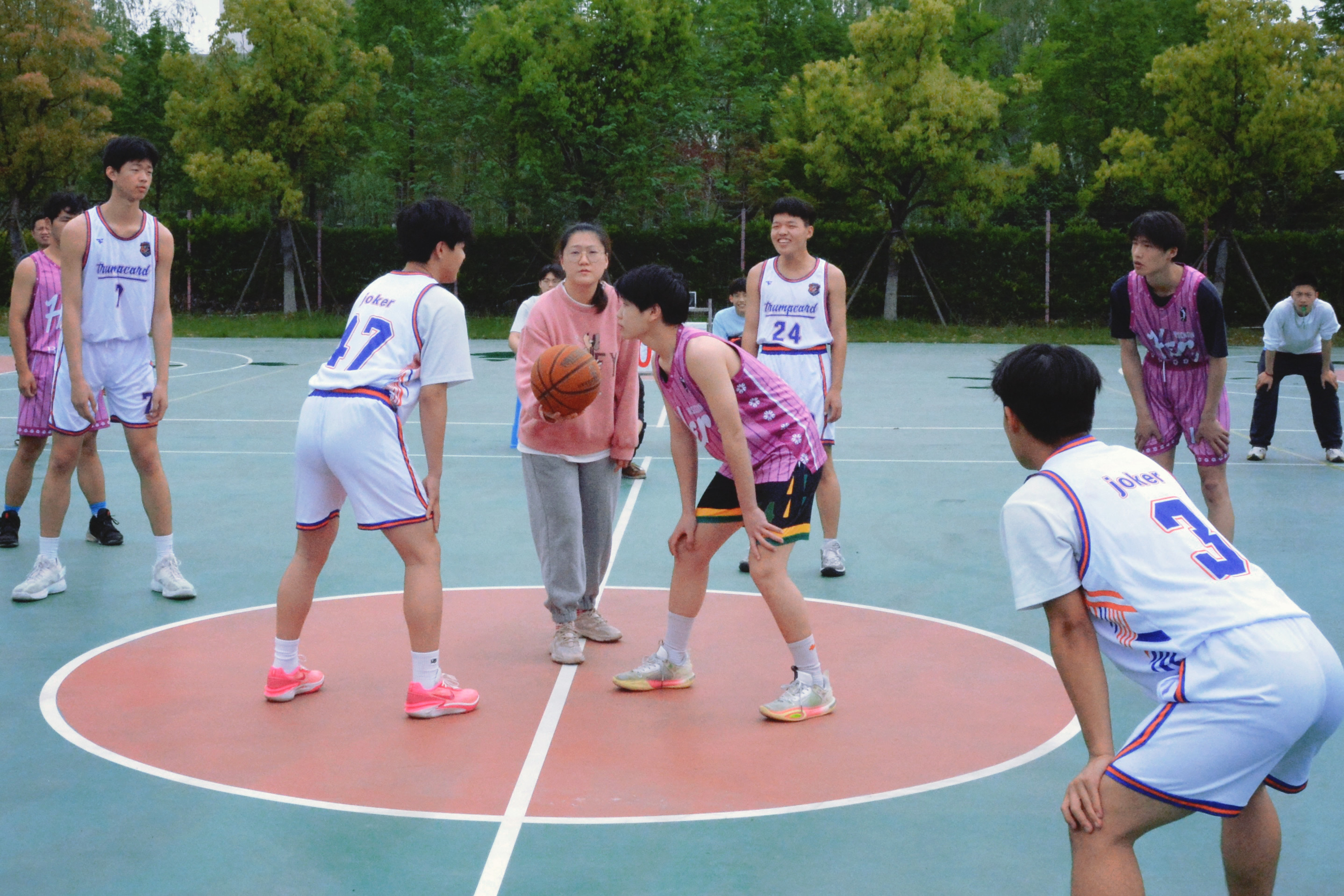 沈文慧為本次籃球賽首場(chǎng)揭幕戰(zhàn)開(kāi)球,2202班與2205班以及2216班與2219班兩組對(duì)陣隊(duì)伍率先出場(chǎng),展開(kāi)激烈對(duì)決。