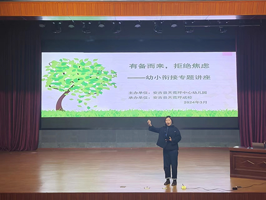 為了讓家長(zhǎng)正確認(rèn)識(shí)幼小銜接工作的重要性,引導(dǎo)家長(zhǎng)有效幫助孩子做好入學(xué)準(zhǔn)備,使其順利步入小學(xué)生活,4月21日上午,安吉縣社區(qū)教育學(xué)院天荒坪分院聯(lián)合天荒坪幼兒園,在天荒坪鎮(zhèn)山河村文化大禮堂舉辦主題為“幼小銜接 我們這樣做”的講座。參加本次活動(dòng)的有天荒坪鎮(zhèn)分管教育副鎮(zhèn)長(zhǎng)陳一鳴、天荒坪中心成校校長(zhǎng)潘育飛、天荒坪鎮(zhèn)各村分管教育領(lǐng)導(dǎo)及上墅鄉(xiāng)幼兒園大班學(xué)生的教師及家長(zhǎng)們。活動(dòng)邀請(qǐng)了安吉縣教育局教育科學(xué)研究中心小學(xué)教研員洪濤漪老師作講座。