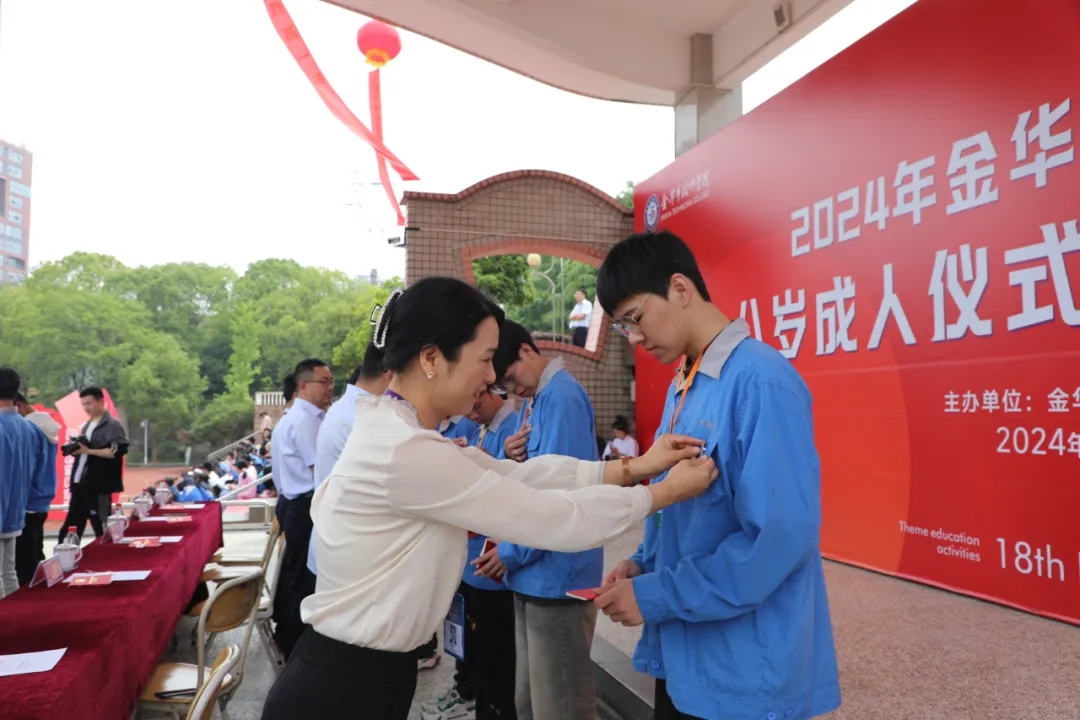 校領(lǐng)導(dǎo)為學(xué)生代表佩戴成人紀(jì)念章。