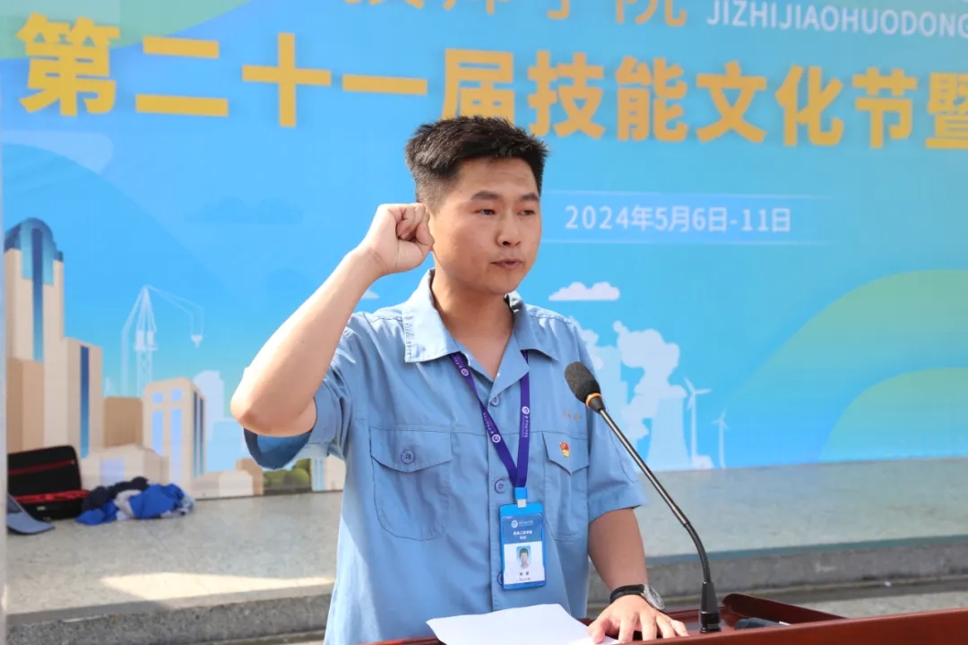 第 47 屆世界技能大賽國家隊隊員、中華人民共和國第二屆職業(yè)技能大賽工業(yè)機(jī)械項目全國第五名、全國技術(shù)能手獲得者機(jī)電工程學(xué)院19機(jī)電班同學(xué)鄭濤代表選手宣誓:嚴(yán)格遵守競賽紀(jì)律,尊重裁判,尊重選手,服從安排,聽從指揮,以良好的精神面貌、較好的技能水平、頑強(qiáng)的拼搏精神,賽出成績,賽出水平,賽出風(fēng)格!
