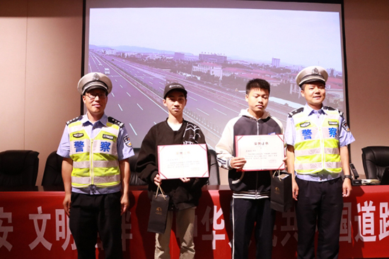 此外,楊學(xué)景和張會統(tǒng)兩位警官還為市中等職技校蔡曜蔚、黃友濤兩位同學(xué)頒發(fā)了“交通安全衛(wèi)士”榮譽(yù)證書,表彰其積極勸阻他人交通違法、維護(hù)交通安全秩序的行為。