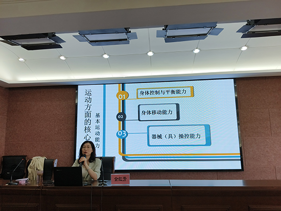 浙江省軍區(qū)汪莊幼兒園副園長(zhǎng)金紅芳作專題講座《基于運(yùn)動(dòng)核心經(jīng)驗(yàn)的幼兒園體育活動(dòng)實(shí)踐》,金園長(zhǎng)先從健康核心經(jīng)驗(yàn)入手,帶著老師重新溫習(xí)小中大三個(gè)年齡段幼兒健康領(lǐng)域的發(fā)展目標(biāo),再通過幾個(gè)優(yōu)秀的體育教學(xué)案例向老師介紹了幼兒園體育活動(dòng)在日常教學(xué)中的實(shí)踐。