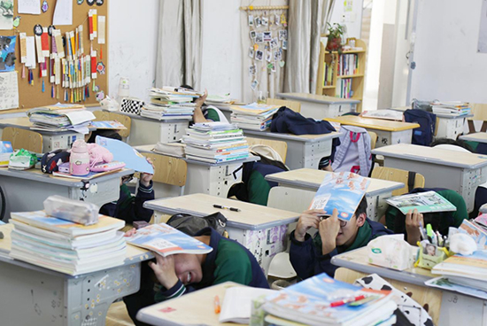 講座結束以后,學校組織全體師生開展了避震逃生演練,廣播發出“地震警報”,上課老師立即停止授課,告知學生“地震來了,不要慌”,指揮學生迅速抱頭,躲在各自的課桌下或課桌旁,盡量蜷縮身體,降低重心,并用書包或書本保護頭部。