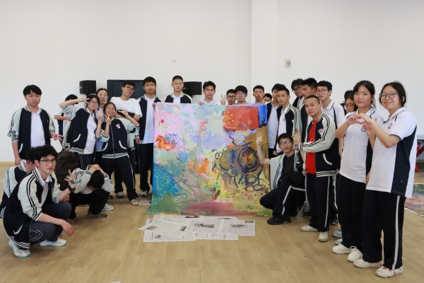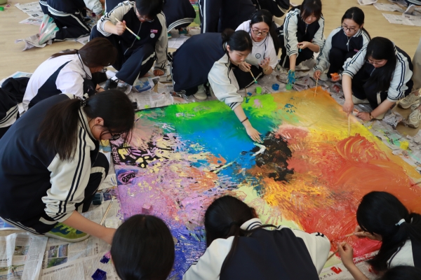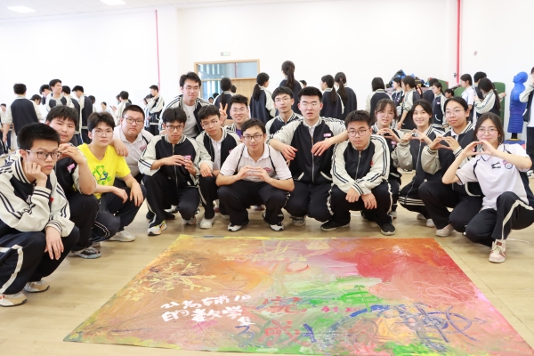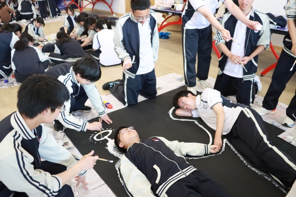 活動中,陳俊杰率先引導(dǎo)各班邀請本班2-3位學(xué)生代表,在畫布上方平躺下來,合作做出象征生命力量的動作,由班級內(nèi)的其他同學(xué)用白色顏料將其外形輪廓拓印下來,讓畫布成為班級全體成員生命力量呈現(xiàn)的平臺。隨后,每位同學(xué)選擇他們喜歡的顏色或是代表他們情緒的顏色以任意形式填補畫布上的空白區(qū)域,讓每個角落都被顏色填滿。最后,每位學(xué)生分享他們的創(chuàng)作感受和對最終作品的看法,并齊心協(xié)力為整幅畫作呈現(xiàn)一個生命力量感的名稱。