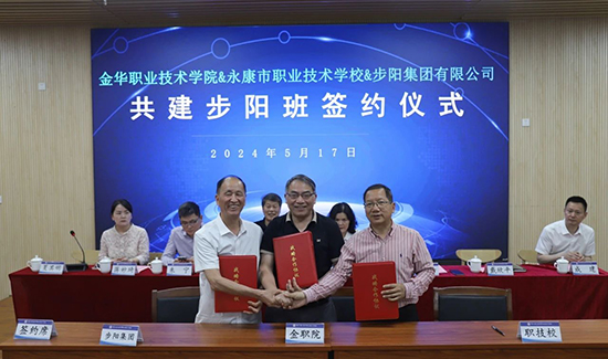 為深化職業院校辦學內涵、拓展校企合作領域、創新校企合作辦學機制,5月17日,金華職業技術學院、浙江省永康市職業技術學校、步陽集團有限公司三方在永康職技校隆重舉行共建“步陽學院”的合作協議簽署儀式。
