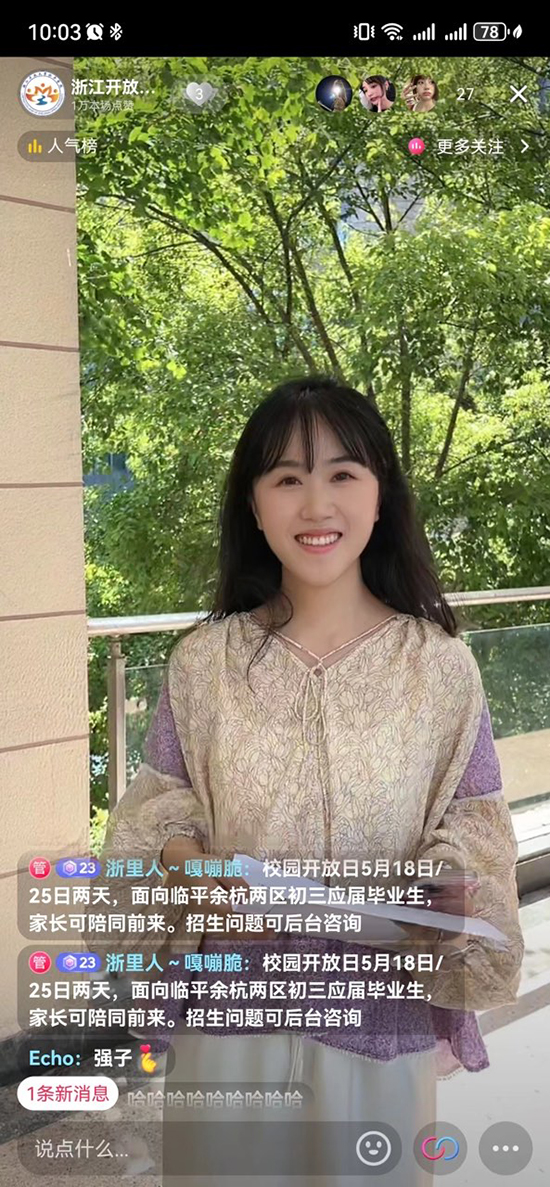 本次校園開(kāi)放日學(xué)校抖音賬號(hào)“浙江開(kāi)放大學(xué)臨平學(xué)院”進(jìn)行現(xiàn)場(chǎng)實(shí)時(shí)直播。