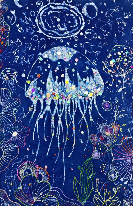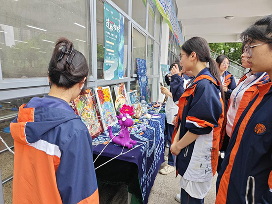 步入展區(qū),首先映入眼簾的是一大幅蠟染作品。學(xué)生通過親手繪制、染色、脫蠟等步驟,將傳統(tǒng)蠟染技藝、刺繡技藝與現(xiàn)代審美相結(jié)合,創(chuàng)作出了這幅耳目一新的蠟染作品。
