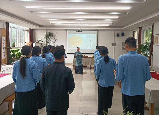 行禮與回禮是中華茶禮儀中非常重要的環節。周曉芳老師針對泡茶過程中面對不同人群的禮儀要求,由表及里地向學生傳授了標準的鞠躬禮、伸掌禮和扣指禮,還特意帶領學生掌握獨創的八步奉禮。周老師生動的演繹、示范和優雅的指導,令在座的聽課老師也受益匪淺。