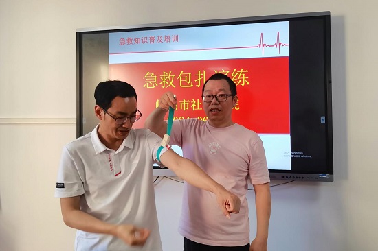 為進一步增強教師安全防護意識,普及急救知識與技能,6月3日下午,嵊州市社區學院在一樓會議室舉辦急救知識培訓活動,對全體教職員工進行了創傷現場急救知識講解及包扎演練。
