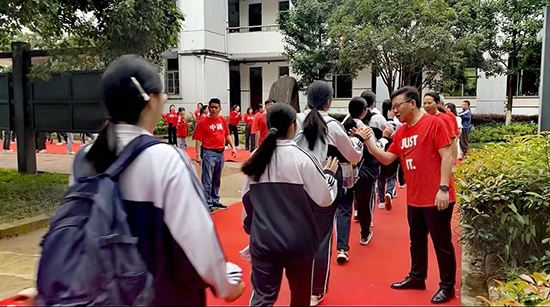 上午7時30分,全體教師身著紅色T恤,精神煥發,面帶微笑,整齊列隊,眼中滿是期待與祝福。學校領導站在高三教學樓前,與陸續走出教室的高三學子們一一擊掌,用最簡單卻最有力的方式為他們加油鼓勁。