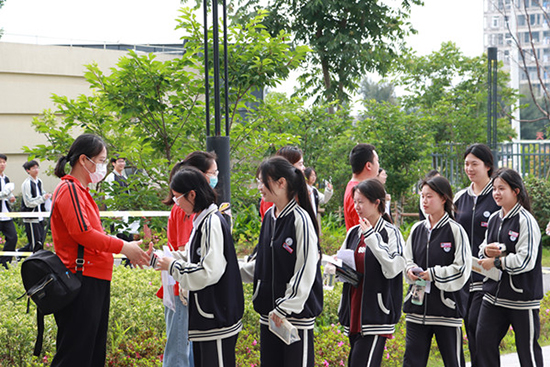 當(dāng)日上午7時(shí)許,學(xué)校領(lǐng)導(dǎo)、高三老師們身著紅衣整齊列隊(duì)在學(xué)??键c(diǎn)入口,為即將踏上高考戰(zhàn)場(chǎng)的考生們鼓舞士氣,將最真摯的祝福送給高三學(xué)子。在一聲聲祝福與擊掌聲中,同學(xué)們昂首挺胸,走向考場(chǎng)。