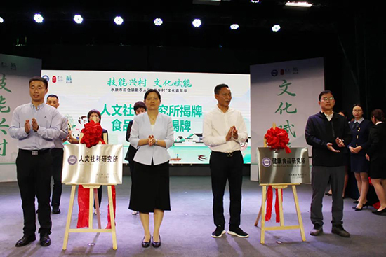 在熱烈的掌聲中,何麗平、曹法余、盧忠健、吳勇共同揭牌永康五金技師學(xué)院“人文社科研究所”和“食品研究所”。