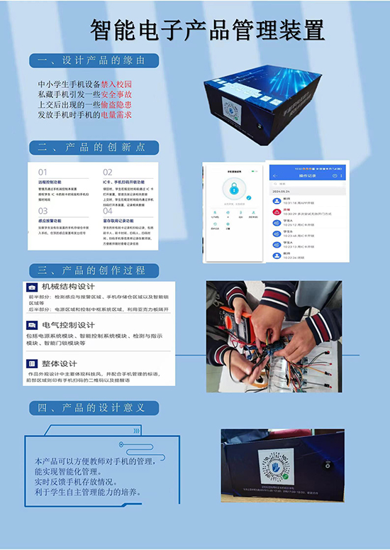 該校沈俊浩、陸心怡、劉程、劉嘉豪團隊憑借未來校園手機管理設計方案——“智能電子產品管理裝置”榮獲省一等獎。這一榮譽的背后,是團隊多個日夜的辛勤付出和緊密合作,更離不開指導老師的用心、精心和悉心。這個富有創意和前瞻性的方案充分考慮了學校、師生和家長的需求,融入了智能化、人性化的設計理念,為解決未來校園中手機管理的問題提供了有力的方案。他們的作品不僅贏得了評委的高度認可,更贏得了在場參展觀眾的一致好評。