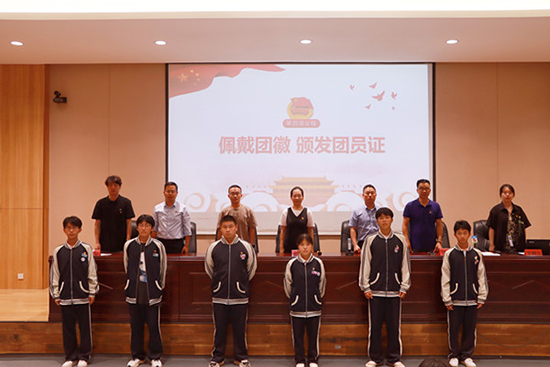 郭海英、蔡其標(biāo)、汪光岳、金松、王金偉、李若鋌為新團(tuán)員代表佩戴團(tuán)徽、頒發(fā)團(tuán)員證,標(biāo)志著他們正式成為共青團(tuán)員。