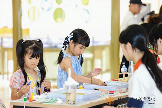 6月23日下午,湖州銀泰城一樓中庭里,做完拓染扇子的小朋友一臉興奮地舉著自己的作品,等待扇面上的顏料晾干。這是浙江省湖州藝術(shù)與設(shè)計學(xué)校第十五屆校企合作成果展中的項目體驗活動之一。