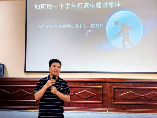 浙江省特級教師、正高級教師陳建仁則以《如何用一個學年打造卓越班集體》為題,向參訓教師們詳細闡述了班級建設的核心要素。他首先分享了自己在班級管理方面的獨到見解和成功經驗,為班主任們提供了一套實用的班級建設方案。陳老師在分享中強調了班級管理的科學性與藝術性,指出卓越班集體的構建需營造積極、和諧的班級文化,要注重關注學生的個性發展,要用愛心和耐心關愛學生,激發他們的潛能,讓他們在成長路上更加自信堅定。