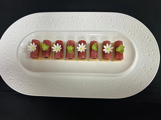 水蜜桃楊梅卷的研發(fā),不僅是校企雙方智慧與創(chuàng)意的結(jié)晶,更是兩地食材文化的一次精彩碰撞。在鮑佶杖老師和謝錡導(dǎo)師的精心指導(dǎo)下,這款甜點不僅在選材上嚴(yán)格把關(guān),更在制作工藝上精益求精,力求將每一道細(xì)節(jié)都做到極致。其色澤鮮艷的外觀、酸甜可口的味道,讓人在品嘗的同時也能感受到夏日里的一絲清涼。