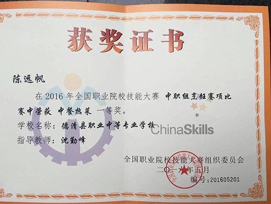 我叫陳遠帆,是浙江省德清縣職業中等專業學校2016屆烹飪專業畢業生。2013年9月,我來到德清職業中專,開啟了人生的職業技能學習征程。2019年至今,我在建德市新安江職業學校任烹飪專業教師,2021年被評為浙江青年工匠。