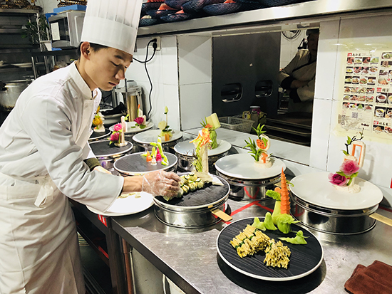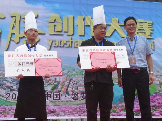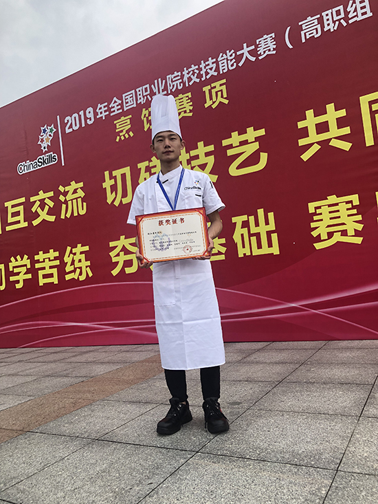 大學期間,始終保持初心,勵志做一位工匠人,艱苦奮斗,勇攀高峰,一直朝著職教這一目標奮進。憑著自己扎實的基礎和努力進了商職院烹飪訓練隊。在學院老師的帶領下,先后獲得2017年浙江省高職高專院校烹飪技能大賽團體賽“熱菜”單項一等獎;2017年中國技能大賽全國烹飪及餐廳服務職業技能大賽“中式烹調”銀獎;2018年浙江省首屆藥膳創新創作大賽金獎,同時破格晉升為技師;2019年全國職業院校高職組烹飪賽項團體二等獎等等;在集訓的日子里,每天5點必會準時起床背誦理論知識,技能的訓練更是會到晚上十一點之后才結束。在參加技能大賽的同時他還在烹飪領域中不斷摸索,在2017年參與烹飪工藝與營養傳承與創新國家教學資源庫工作;2018年參加浙江養生菜制作項目;2019年參與《古韻山家宴》設計與開發制作項目,獲浙江省第十六屆“挑戰杯”大學生課外學術科技作品競賽校內選拔賽二等獎;2019年參與淳安千島湖特色菜肴設計與制作項目等等。