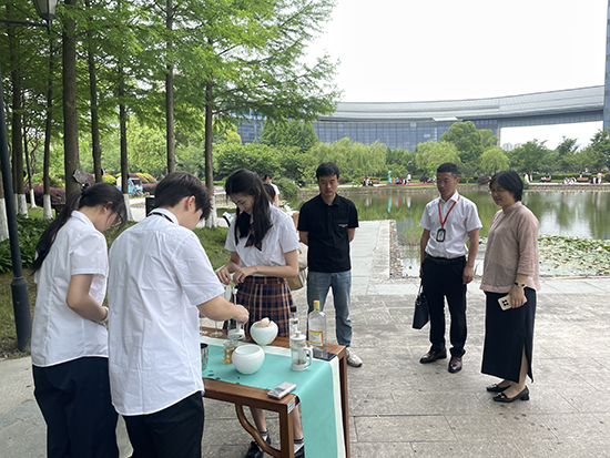 在大學老師的引導下,同學們來到了茶藝空間和茶藝教室進行參觀和體驗,其中的選茗、烹茶技術、茶具樣式和環境的選擇創造等內容讓大家耳目一新,同學們沉浸式體驗了茶藝與美學的融合。
