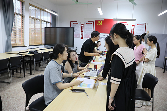 班主任向新生與家長確認信息、發放資料、提醒注意事項。