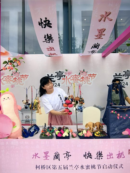 活動當天有很多關于水蜜桃主題的展位,蘭亭成校蘭彩拼布共富工坊展位也在其中,展臺上擺放著用拼布手藝縫制的水蜜桃,和原創水蜜桃環保袋,以及一些拼布的小手工作品,吸引了很多游客的駐足觀賞,水蜜桃的拼布工藝品甚至可以以假亂真,小朋友們都愛不釋手。