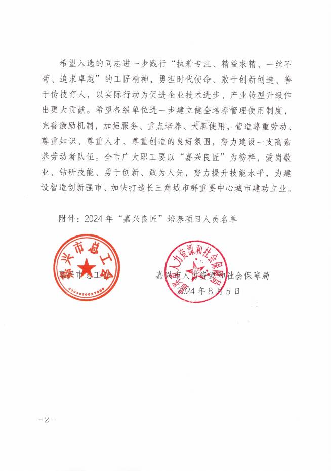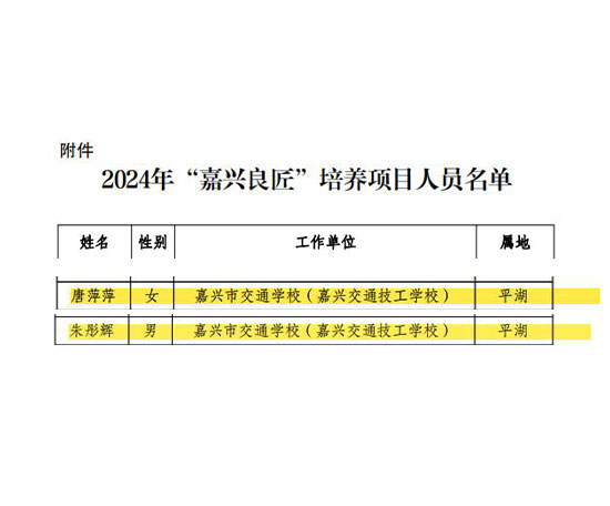 近日,2023年度“星耀南湖”拔尖人才計劃高技能人才、工程師人才項目入選名單的通知中高技能拔尖人才(嘉興巧匠),嘉興市交通學校周春輝老師榜上有名。從嘉興市總工會、嘉興市人力資源和社會保障局公布2024年“嘉興良匠”培育項目人員名單中獲悉,學校唐萍萍、朱彤輝兩位老師入選!喜訊連連,為他們點贊!