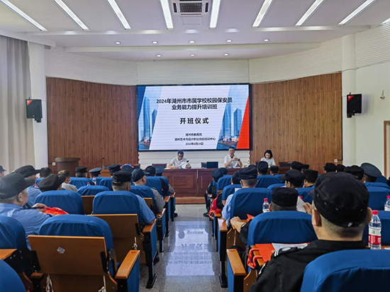 8月20日,2024年湖州市市屬學校校園保安員業務能力提升培訓班在浙江省湖州藝術與設計學校順利開班,90余名安保人員參加本次培訓。市教育局校園安全管理處處長陳金星,干部沈敏華,校培訓處副處長吳佳出席。