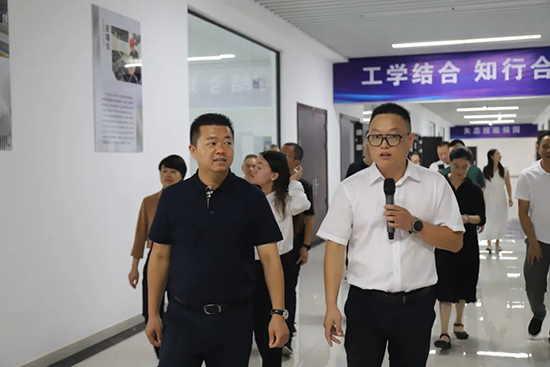 在產教融合大樓,考察組實地觀摩了學校校企合作成果“通軸門智能化無人產線”,并紛紛駐足欣賞藝術與技術結合下的“特色門”。隨后,考察組移步模具智能制造中心與智能控制類學習工作站,深入了解了學校在校企合作、產教融合領域所取得的階段性成果。