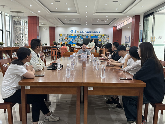 覃浩軒與學校任課教師們圍坐在一起交流。老師們依次分享了課程教學情況,就如何進一步優化教學方法,提升課堂教學質量進行了探討。