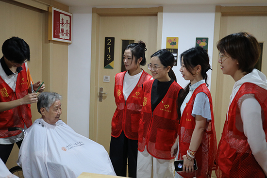 綜合專業部“春風和睦”志愿服務分隊用精湛的手藝為老人們修剪頭發,流暢的手法和細致的服務受到他們的連連稱贊。