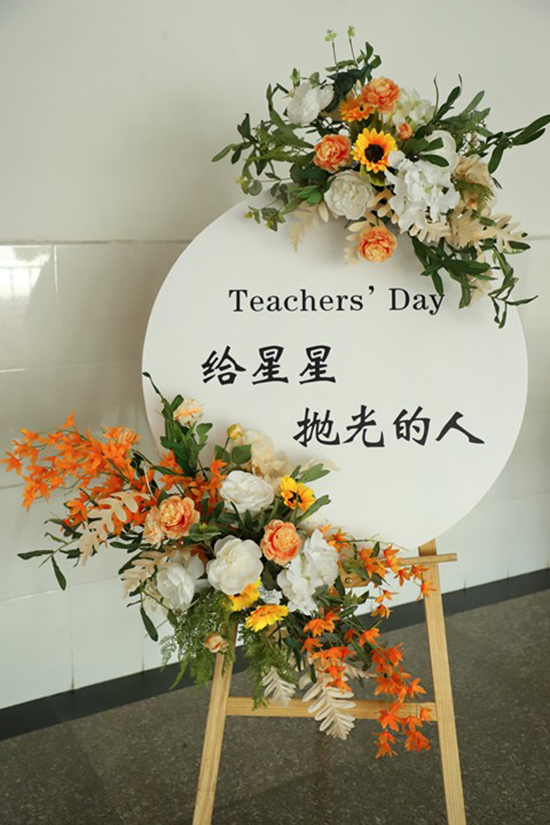 教師節前夕,工會就組織人員緊鑼密鼓地布置兩個打卡處“一路向陽”主題墻和“給星星拋光的人”主題卡牌。打卡處裝飾以橙色與綠色花束,突出了第四十個教師節“大力弘揚教育家精神,加快建設教育強國”的主題及“潤澤每一個生命的適性成長”的龍山精神,美麗溫馨,儀式感滿滿。“咔嚓咔嚓”拍照打卡的聲音不絕于耳。
