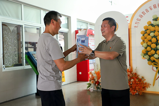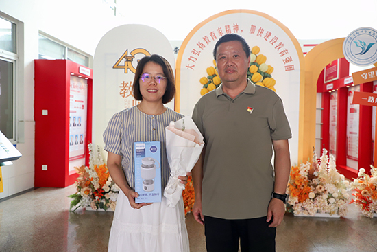 校領導為教師們分發教師節禮物:一束代表詩意的鮮花和一份代表生活的禮品,寄托了學校對全體教職員工“既能腳踏實地,又能心懷詩意”的期望。“教師節快樂!”一聲簡單卻溫馨的祝福,溫暖了大家的心。張校長和老師們親切交流并合影留念,場面熱鬧歡馨。