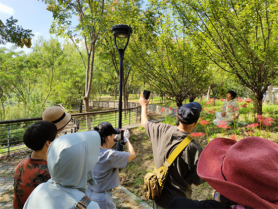 9月,秋高氣爽,藍藍的天空,白白的云,美麗的彼岸花已然盛開,如此美景怎能不記錄下來。學員們在秦盱峰老師的帶領下,找好角度,拍攝彼岸花的美。秦盱峰老師說道:“記得運用所學構圖,背景可以選擇天空,因為比較干凈。”
